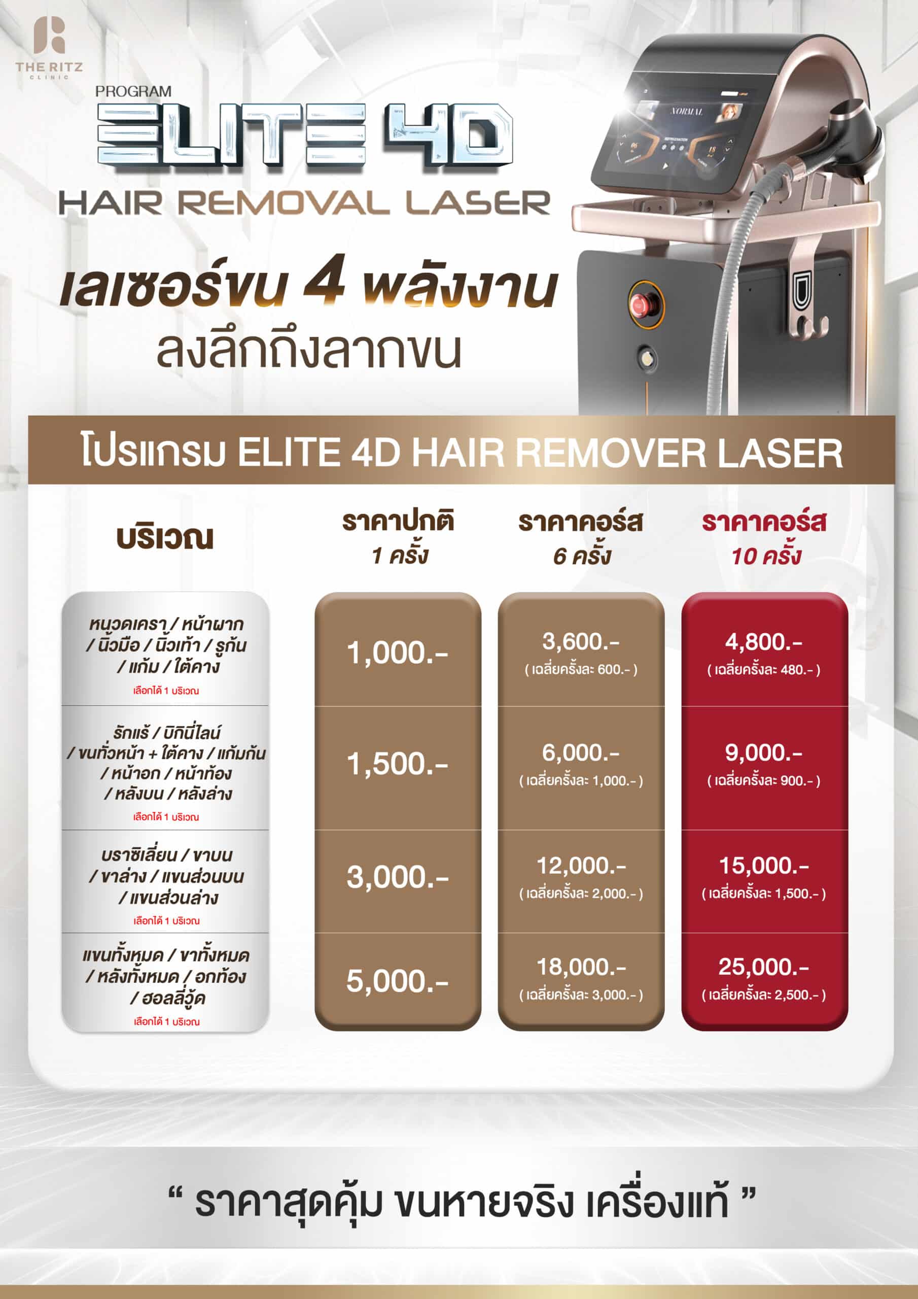 THE RITZ Hair Removal Laser เลเซอร์กำจัดขน เป็นโปรแกรมกำจัดขนที่ผู้เข้ารับการรักษาสามารถเลือกบริเวณที่ต้องการกำจัดขนได้ เช่น หน้าผาก, หนวด, คาง, จอน, เครา, ใต้คาง, แก้มก้น, รูทวาร, บิกินี่ไลน์, บราซิลเลี่ยน, รักแร้, หน้าอก, หน้าท้องต้นขาทั้งครึ่งหน้าและครึ่งหลัง, หน้าแข้ง, ขาล่าง, หลังเท้า, แขนส่วนบนและล่าง, นิ้วมือ, หลังมือ, บริเวณหลังส่วนบนและล่าง เป็นต้น
